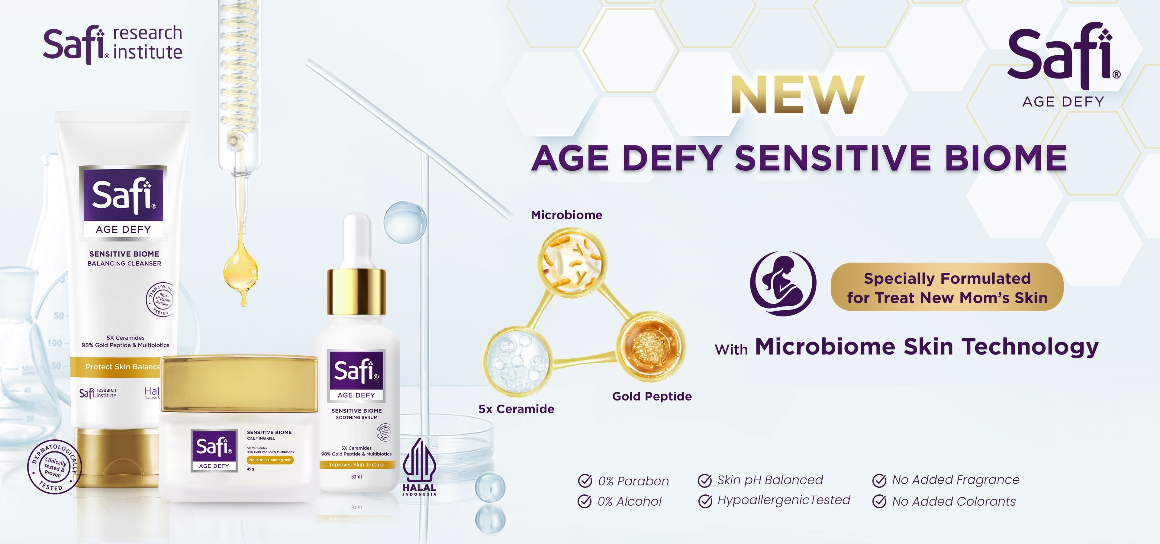 Merawat kulit setelah melahirkan mungkin membutuhkan sedikit usaha ekstra, tetapi dengan pendekatan yang tepat, Momsbisa mendapatkan kembali kulit glowing dan sehat. Rangkaian produk Safi Age Defy Sensitive Biome bisa menjadi sahabatMoms dalam menjaga dan merawat kulit di masa pasca melahirkan. Produk ini tidak hanya membantu menjaga kesehatan kulit,tetapi juga bekerja untuk menguatkan skin barrier, yang penting untuk melindungi kulit dari kerusakan lebih lanjut.Dengan formula yang lembut namun efektif, Safi Age Defy Sensitive Biome bisa menjadi sahabat terbaik Moms dalamperjalanan mengembalikan kecantikan kulit pasca melahirkan.