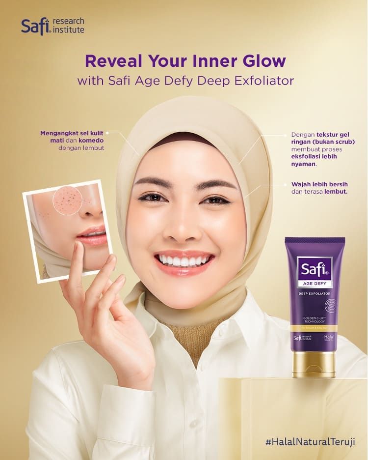 Untuk hasil yang maksimal dan tetap nyaman di kulit, kamu bisa mencoba Safi Age Defy Deep Exfoliator. Dengan Improved Formula Golden C-Lift Technology dan Beetox Technology, produk ini menggabungkan manfaat 24K Gold Extract, Glutathione, Vitamin C, dan Propolis dalam bentuk gel ringan tanpa scrub. Eksfoliator ini membantu mengangkat sel kulit mati serta komedo hitam dan putih dengan lembut, menjadikan kulit terasa lebih halus, bersih, dan segar bercahaya. Kandungan aktifnya juga mendukung kulit tampak lebih muda, cerah, dan tenang tanpa rasa perih atau kering setelah pemakaian.