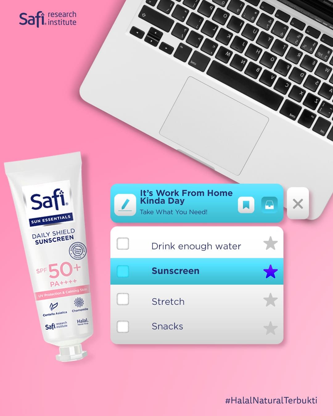 Pilih sunscreen yang ringan dan cepat meresap: Ini penting agar nyaman digunakan setiap hari, bahkan saat hanya beraktivitas di rumah. Produk seperti Sun Essentials Daily Shield Sunscreen dari SAFI hadir dengan formula ringan yang cepat meresap tanpa meninggalkan rasa berminyak, sehingga cocok digunakan bahkan sebelum menggunakan makeup atau skincare lain.