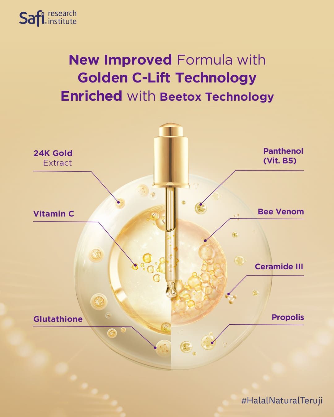Dengan formula yang telah disempurnakan, eliksir ini menggabungkan dua teknologi unggulan: Beetox Technology di lapisan atas untuk efek anti-aging, serta Improved Golden C-Lift Technology di lapisan bawah untuk perawatan pigmentasi dan pencerahan kulit. Kombinasi bahan-bahan aktif seperti 24K Gold Extract, Glutathione, Vitamin C, Propolis, dan Bee Venom bekerja sinergis memberikan hasil optimal.
