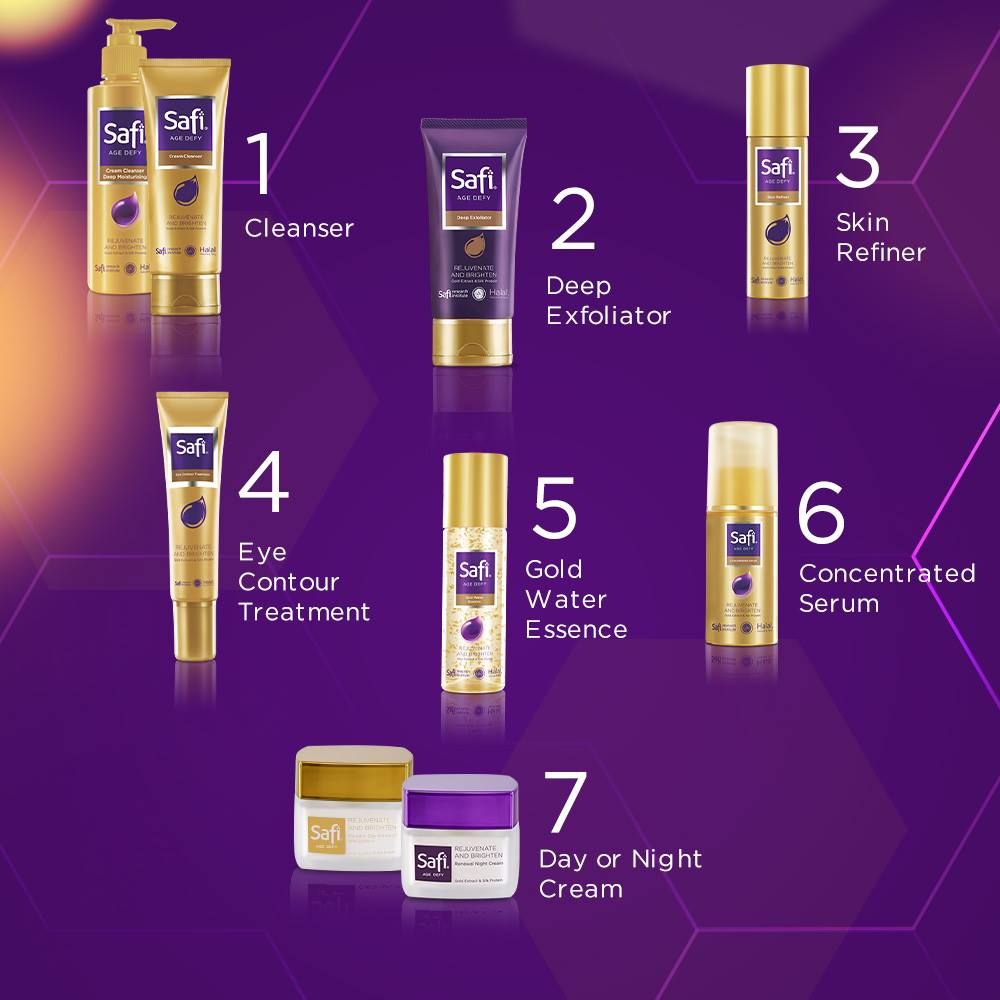 Mulai harimu dengan membersihkan wajah menggunakan Safi Age Defy Cream Cleanser yang diperuntukkan bagi kulit berminyak atau Cream Cleanser Deep Moisturising dengan pH seimbang yang diformulasikan khusus untuk kulit kering. Kandungan Gold Extract, Silk Protein, dan Vitamin C di dalamnya membersihkan wajah dengan lembut. Dengan pH seimbang, kulit akan terhindar dari kekeringan serta tanda-tanda penuaan.